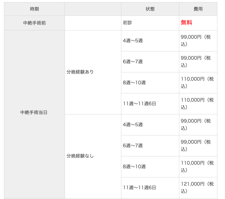 분만 경험이 없는 임산부의 11주 태아의 낙태 비용은 121,000엔(약 120만원)으로 가격이 올라간다. 출산 경험이 없으면 자궁경관이 아직 딱딱한 상태여서 수술 난이도가 올라가기 때문에 비싼 것이라고 한다.