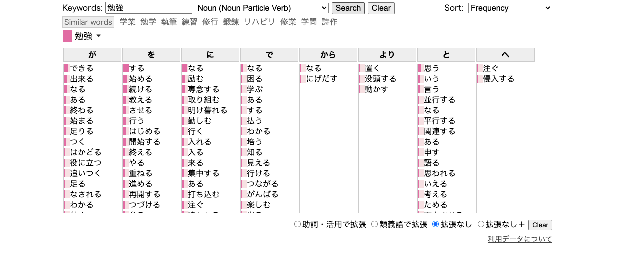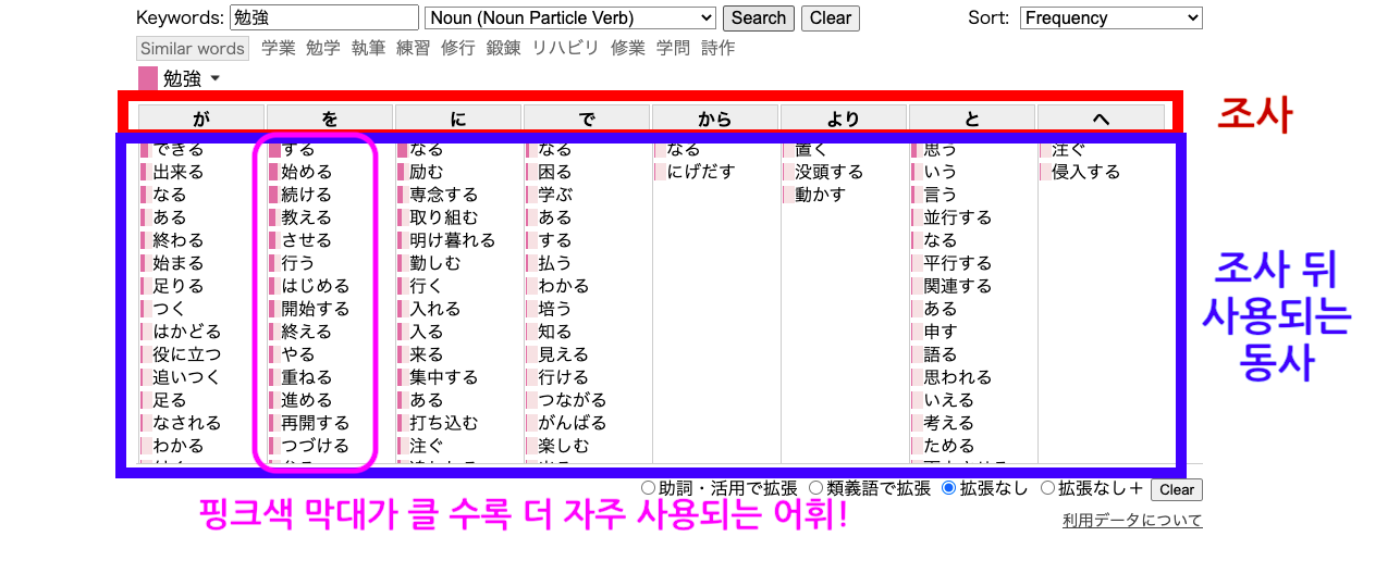 제일 윗 줄의 "が、を、に、で、から、より、と、へ”가 내가 검색한 "勉強”와 함께 사용될 수 있는 조사를 나타낸다.