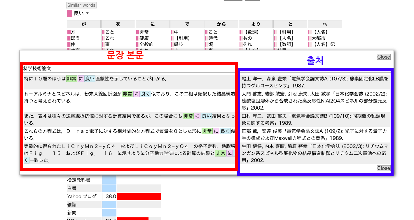 마찬가지로, 서적 / 인터넷 글 / 잡지 / 신문 등에서 수집된 문장들의 정보들도 이와 같은 형식으로 전부 서치가 가능하다.