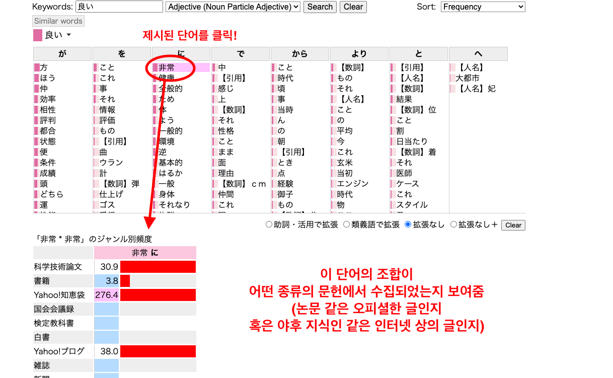 이 사이트의 대표적 서비스는 "같이 쓰여야 자연스러운 문장의 쌍(Colloation)"을 보여주는 것이다.