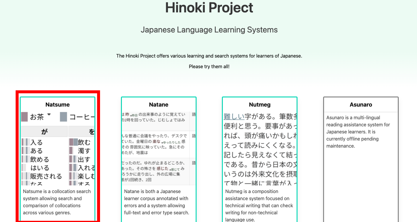 1) Natsume: Natsume is a collocation search system allowing search and comparison of collocations across various genres.